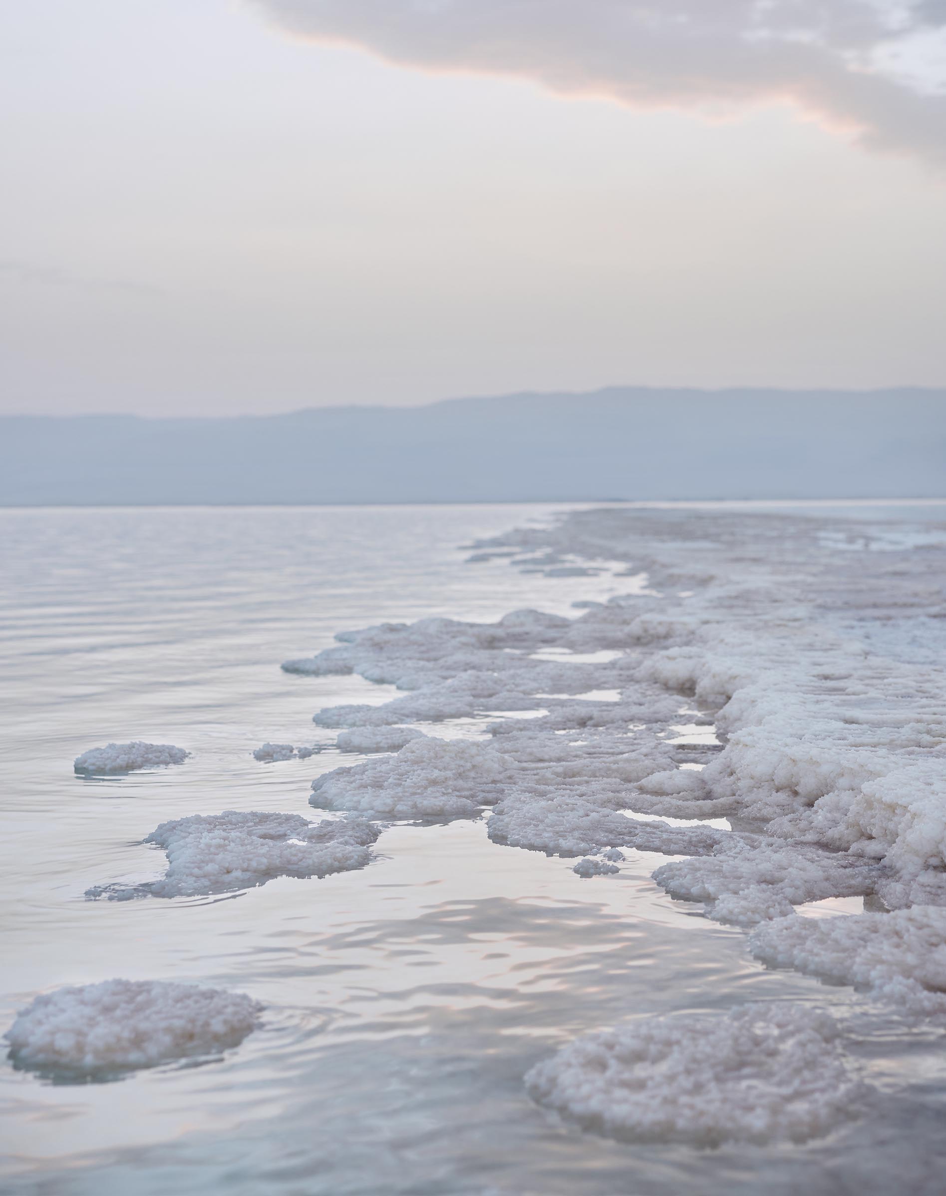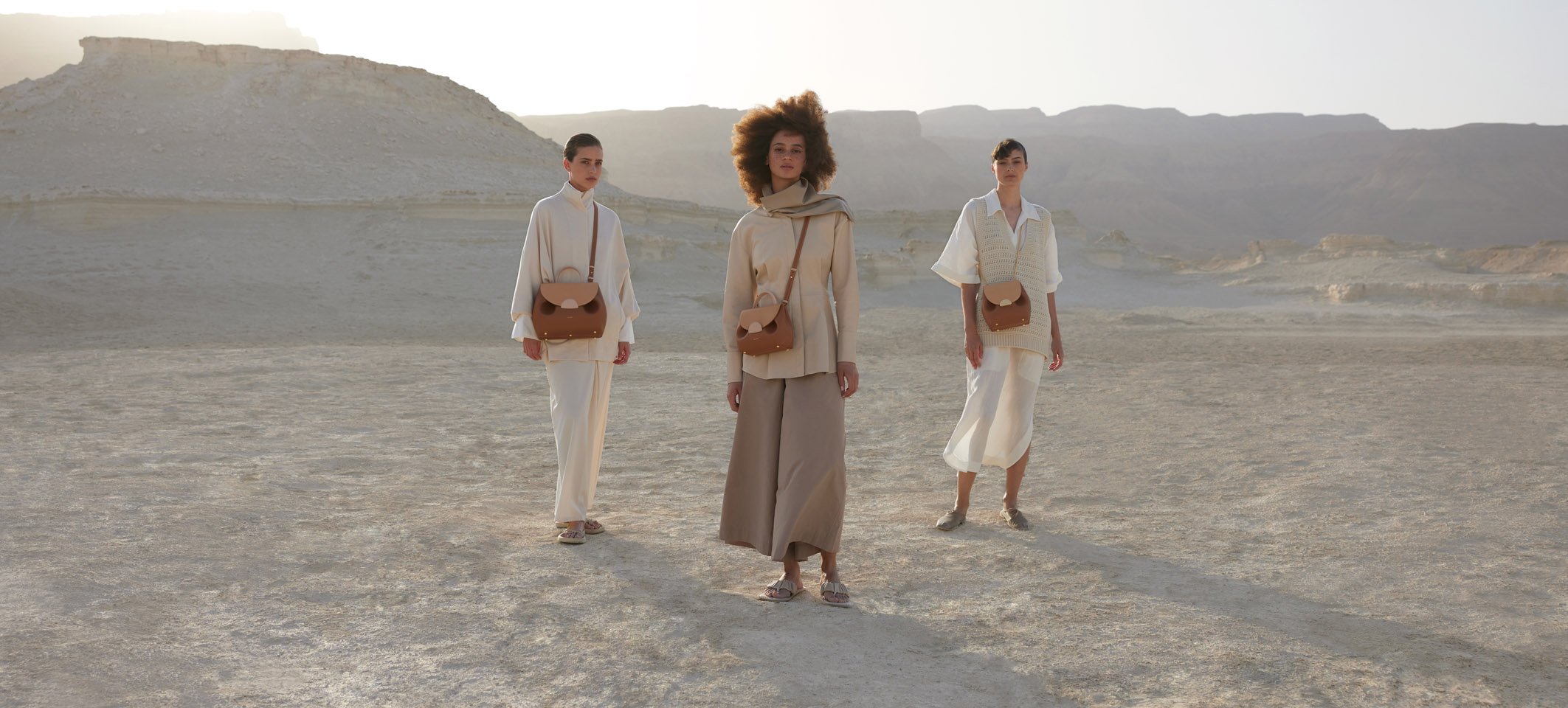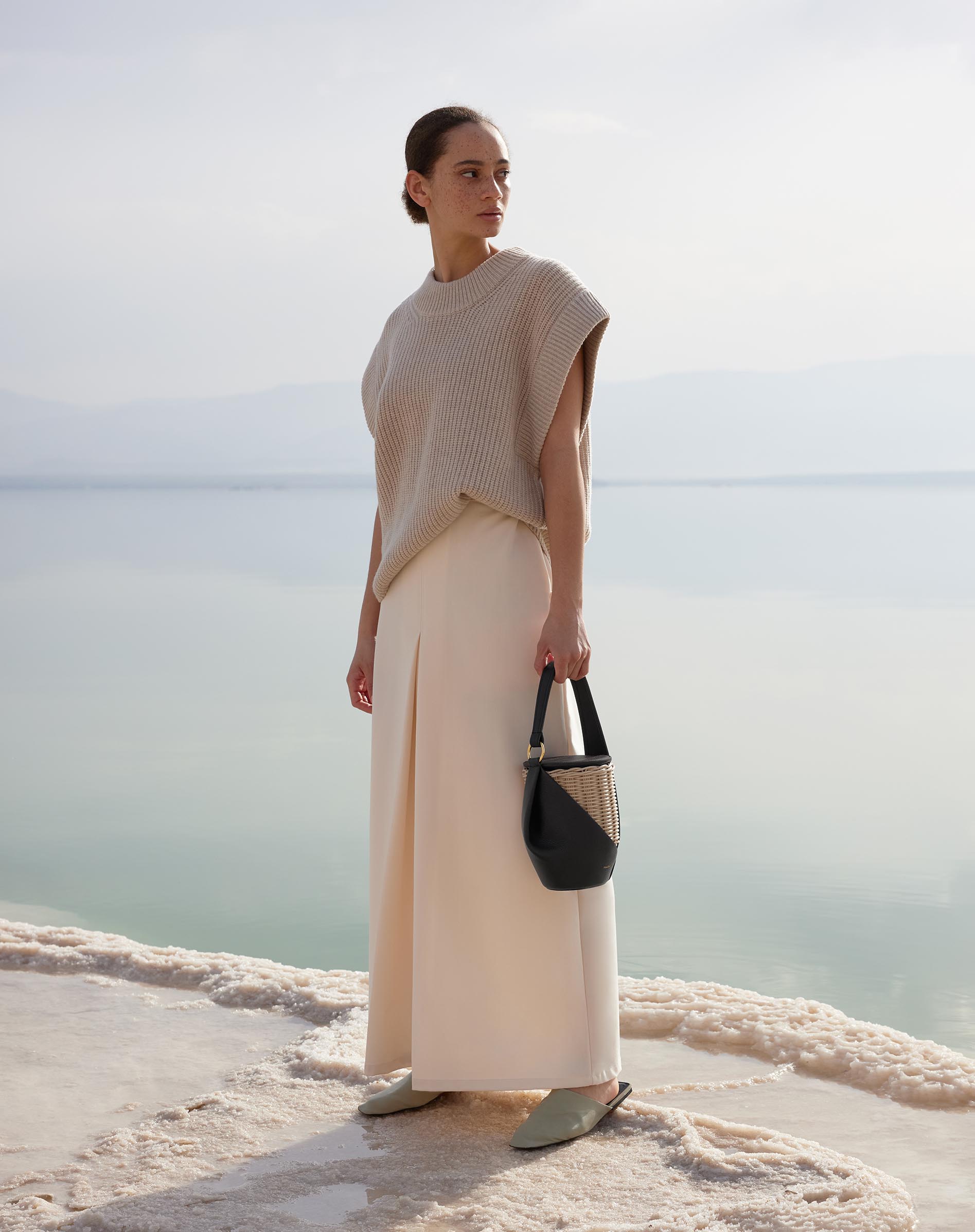 Les paysages minimalistes de la Mer de sel. C’est au bord de la Mer Morte que la collection de maroquinerie Polène est mise en lumière. Un lieu choisi pour sa dualité : tour à tour minimaliste et pluriel. Épuré par sa superposition de lignes planes, mais versatile quand l’eau et les parterres de sel se métamorphosent pour refléter les couleurs du ciel.
