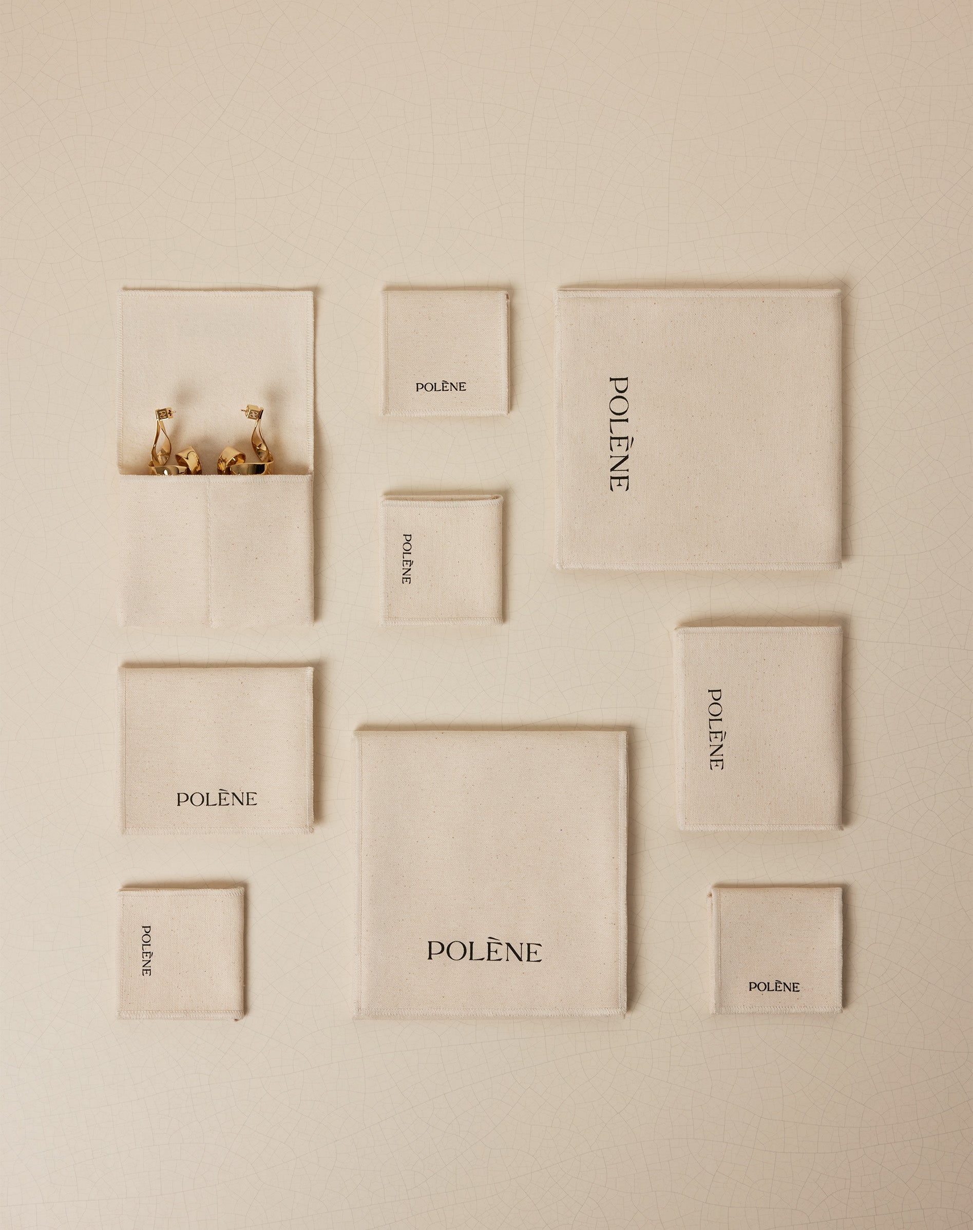 The jewelry is placed in a 100% cotton pouch for protection. Necklaces, chains, and pendants are held in place by elastic bands to prevent tangling. The earring pouch has two separate pockets to separate the pair and keep the two earrings from rubbing together.